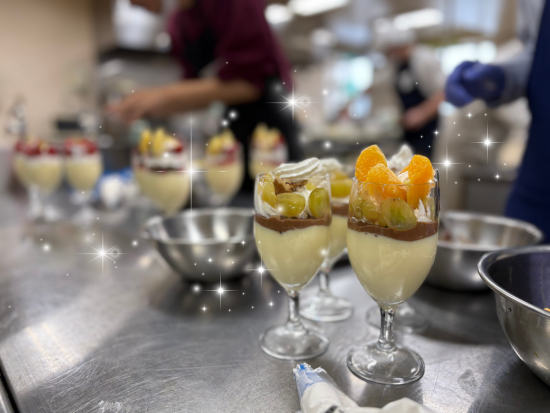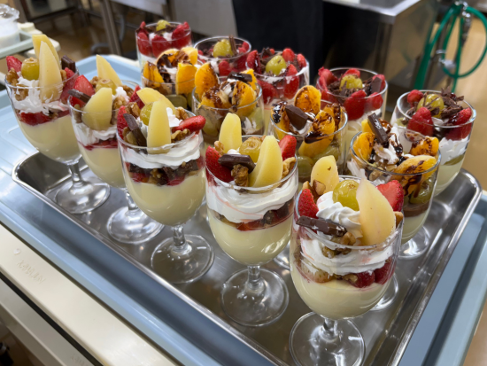 今回は内定者研修の一環として、「オリジナルフルーツデザート」作りに挑戦しました。12月から少しずつ企画を進め、今回はいよいよ調理本番。参加した内定者一人ひとりが、自分なりのアイデアを形にし、オリジナリティあふれるデザートを完成させました。