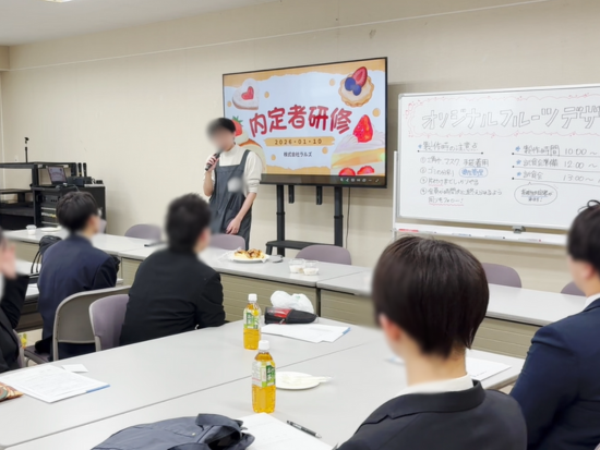 大学生内定者は、これまでの研修で学んだ原価や製造工程、見た目の工夫などを意識しながらデザートを制作。当日、高校生内定者に向けて、デザートのコンセプトやこだわりポイントを自分の言葉で説明しました。高校生内定者からは、